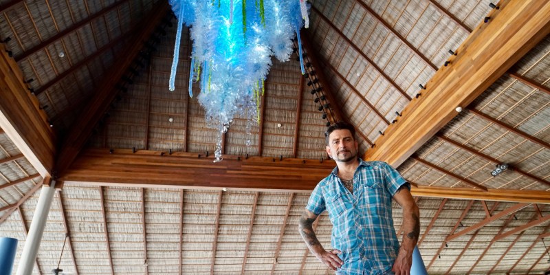 The life-size structure, built at 5 meters x 5 meters x 7 meters, hangs from the ceiling and serves as an educational and interactive touchpoint for guests who find themselves enamored by the piece. Resembling a jellyfish, a species known for being an indicator of climate change, EvoGyre makes a direct connection between the surrounding marine environment of the Maldives and the impact of plastic. Inspired by THE MURAKA and the surrounding Maldivian community, EvoGyre serves as a visual reminder of the humankind responsibility to protect the oceans.