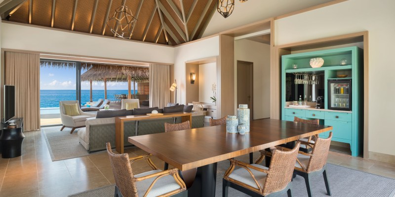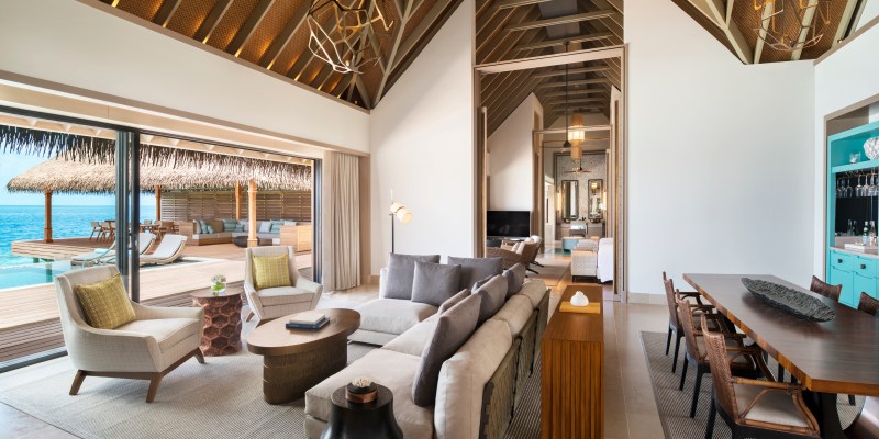 Waldorf Astoria Maldives Ithaafushi Two Bedroom Overwater Villa Living and Dining Area