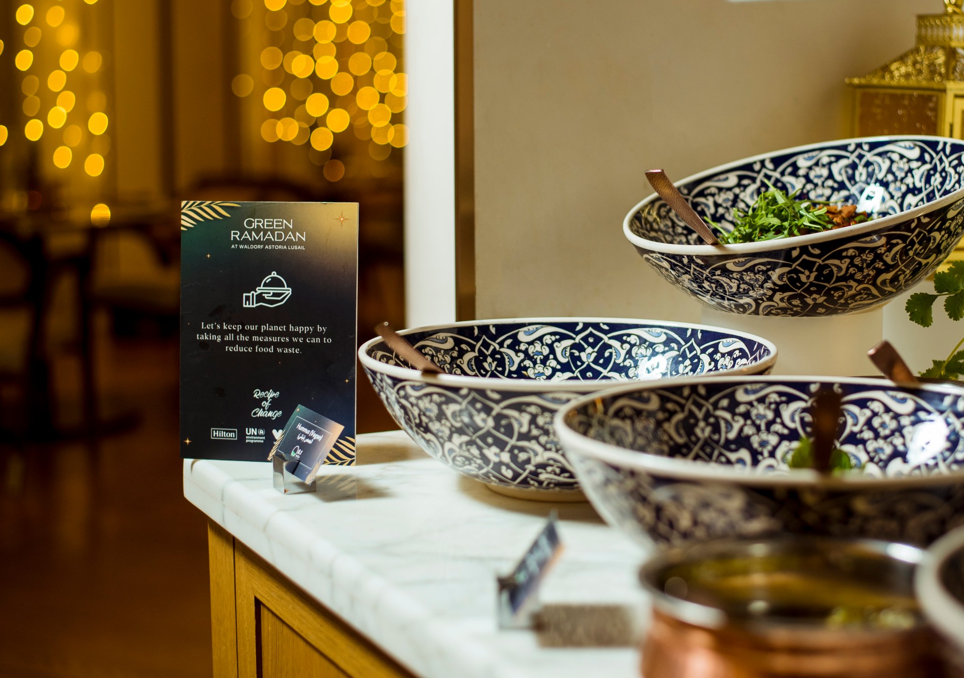 To measure, manage, and mitigate food waste across key markets in the Middle East, the Green Ramadan initiative was implemented in three of Hilton’s hotels: Waldorf Astoria Lusail Doha, Conrad Dubai, and Hilton Riyadh Hotel & Residences. The first week of the campaign served to create a data baseline, after which additional behavioural interventions were incorporated into the buffet and dining areas – including visual prompts and key messages from UNEP West Asia’s ‘Recipe of Change’ Sustainable Ramadan initiative.