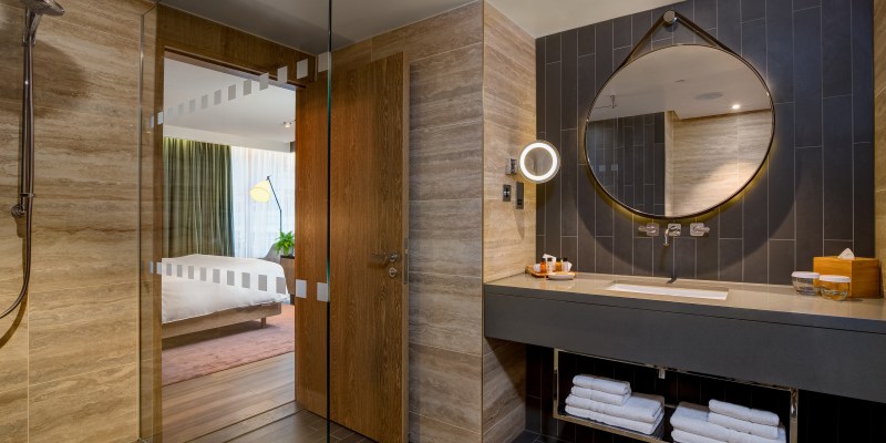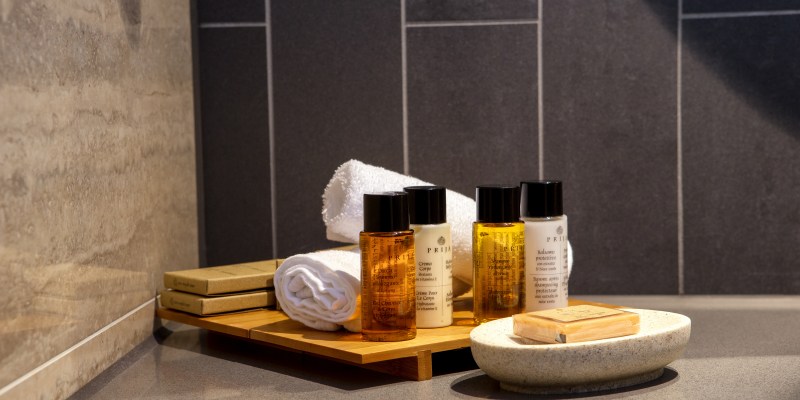 The suite provides PRIJA ginseng, earthly hotel toiletries such as shampoo and conditioner and essentials such as a shower cap, vanity and nail kit (made with recycled packaging).