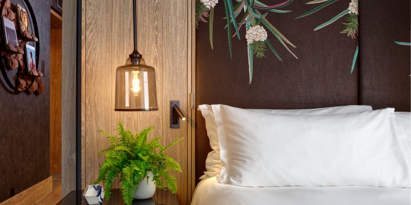The suite features a Piñatex leather headboard hand-embroidered by local embroidery artist Emily Potter. Pillow options include anti-bacterial, non-allergenic and environmentally sourced material to replace feather down.