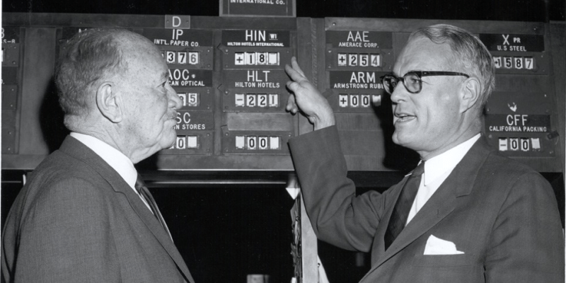 First listing of Hilton International Stock on the New York Stock Exchange. Keith Funston, NYSE President, points out the listing to Conrad Hilton.