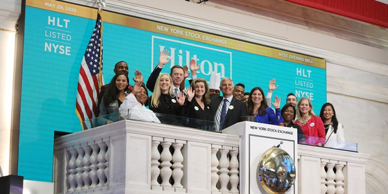 Hilton CEO Chris Nassetta, joined by executives and team members from Hilton hotels around the United States, celebrates Hilton’s 100th anniversary by ringing the opening bell at the New York Stock Exchange on Wednesday, May 29, 2019.