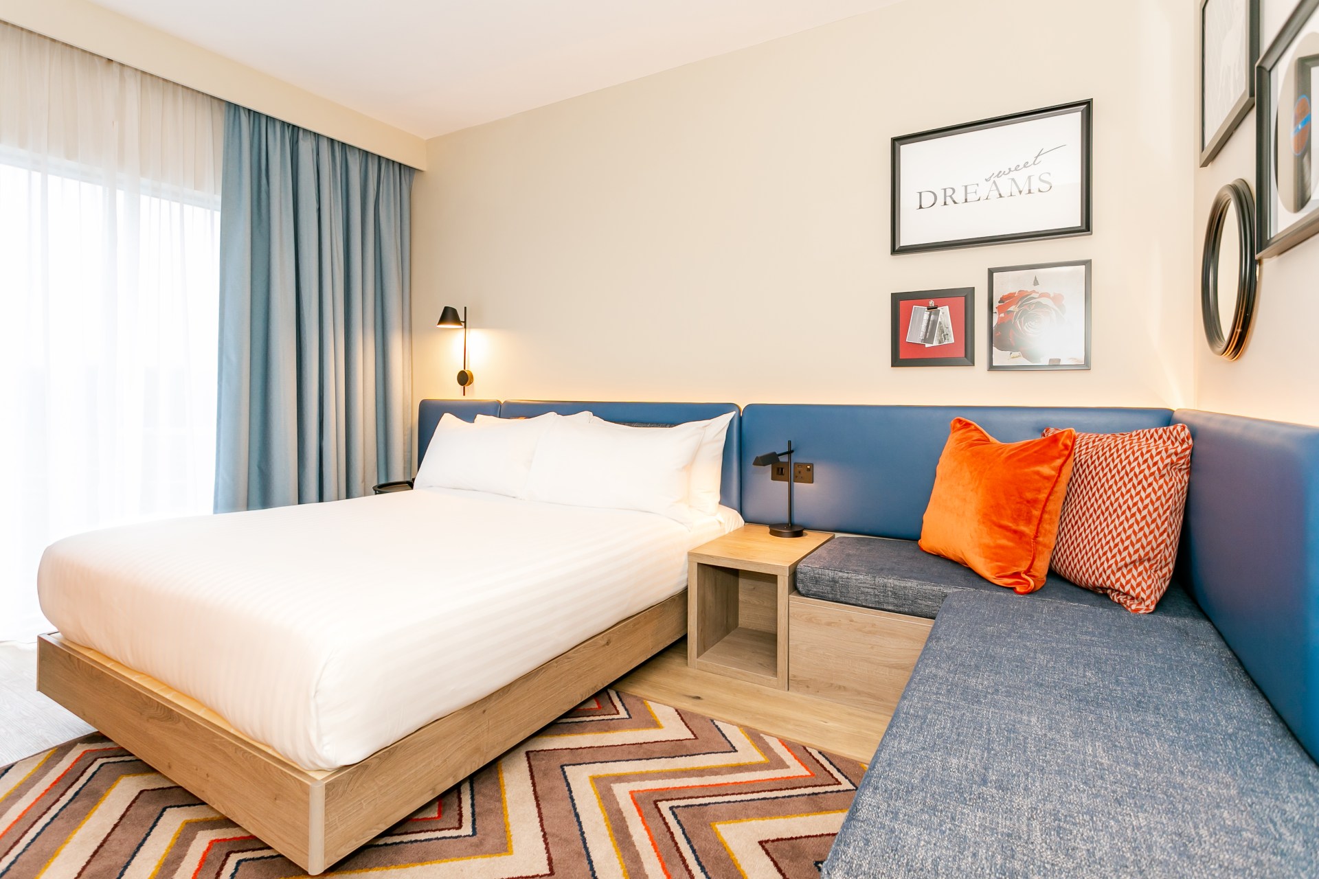 Conrad Seoul - Guest Room, kids coloring at desk while grandfather watches lounging with book on guest bed