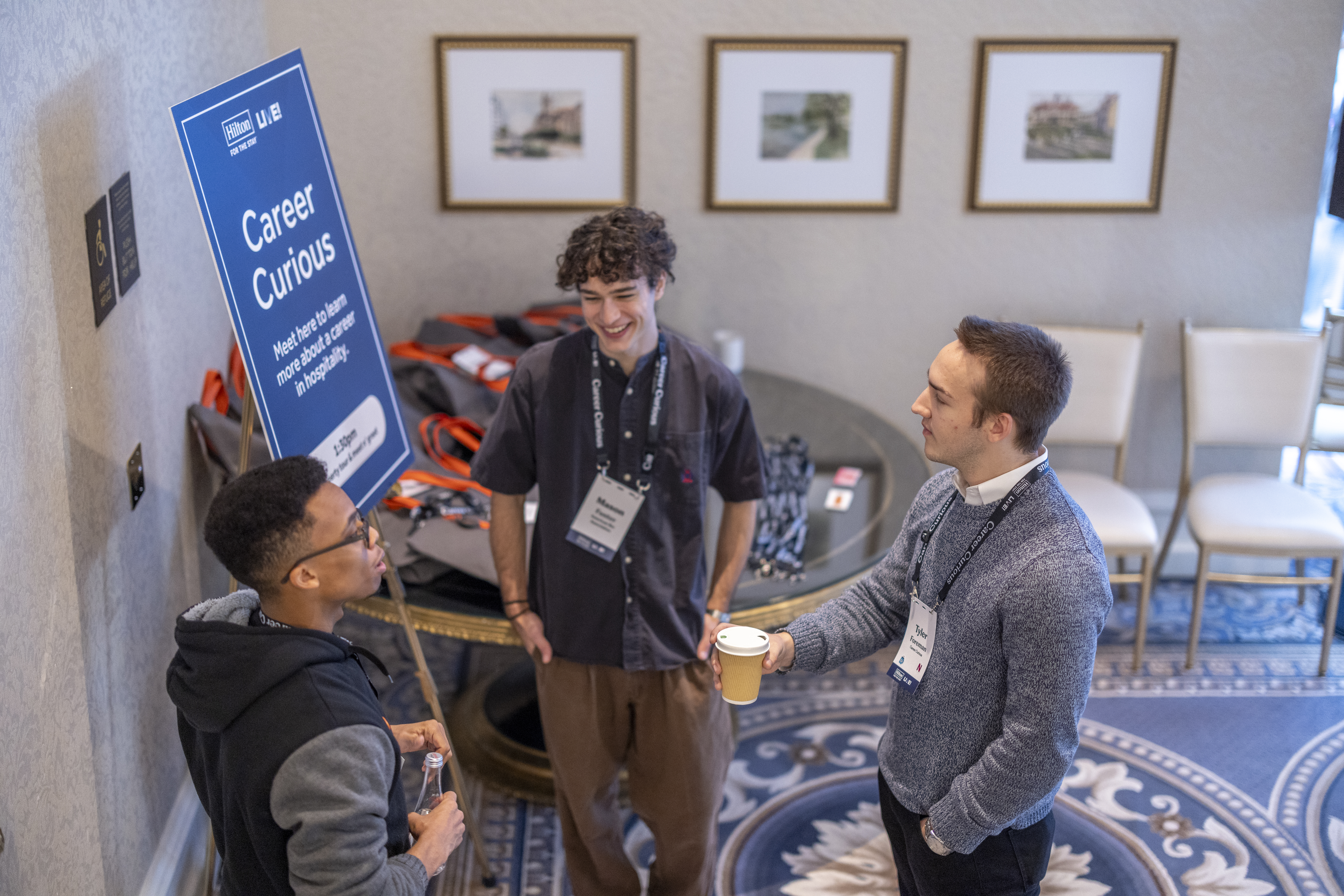 Hilton's Why We Gather Report - The Blueprint - Networking, Three people wearing name tags lanyards networking in a room with a sign