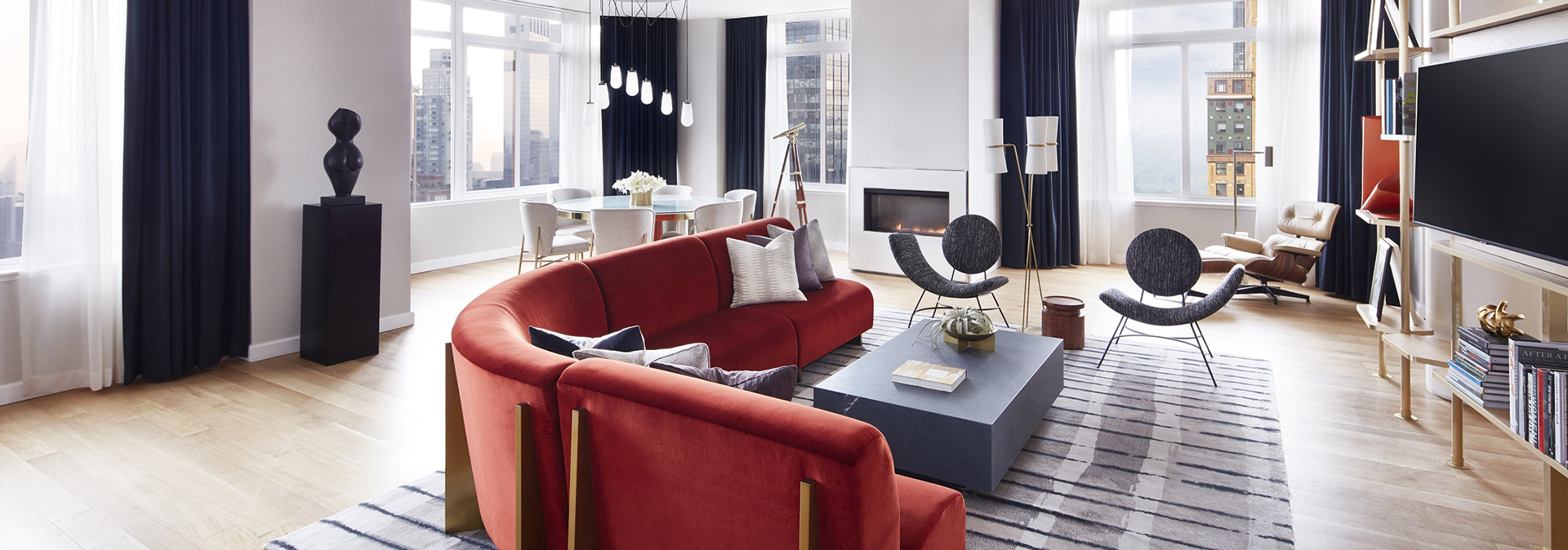 - Penthouse on 54 (3,000 square feet) is a two-story, two-bedroom suite. The first floor entertaining and living area has wrap-around views of Central Park and Manhattan; a fireplace; an original Eames chair; and a custom-designed bold red sofa inspired by nearby and soon-to-reopen Museum of Modern Art (MoMA). A floating staircase leads to two spacious master bedrooms with luxurious king beds, walk-in closets and marble-clad bathrooms with deep soaking tubs, all boasting views of the surrounding city.