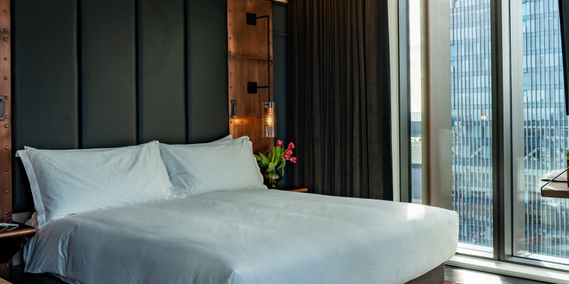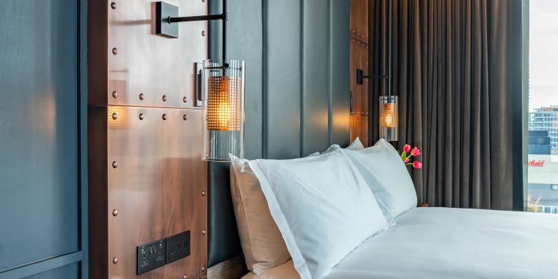 The Gantry’s architecture, influenced by Stratford’s locomotive manufacturing history, sports a delicate yet distinctive exterior frame formed by slim vertical fins reminiscent of railway lines. The hotel’s design draws inspiration from New York’s famous Flatiron building, with its narrow triangular footprint and industrial Victorian East London, with an aesthetic that seeps through into the hotel’s interiors with regular contrast of raw hard materials and soft furnishings. The hotel’s rooms, a mixture of suites and guest rooms, feature copper and dark metal furnishings with natural wooden and velvety textures, all bathed in light from large floor to ceiling windows.