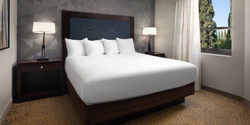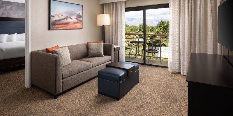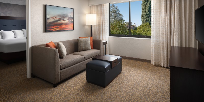 The hotel features ample indoor and outdoor meeting space, with a 3,240-sq.-ft. ballroom and seven separate breakout rooms. Additional amenities include a 24-hour convenience store, business center and fitness center and a heated outdoor pool. Each suite is equipped with complimentary Wi-Fi, a living area, coffeemaker, microwave, mini refrigerator and two HDTVs with movies for guests to stay entertained.
