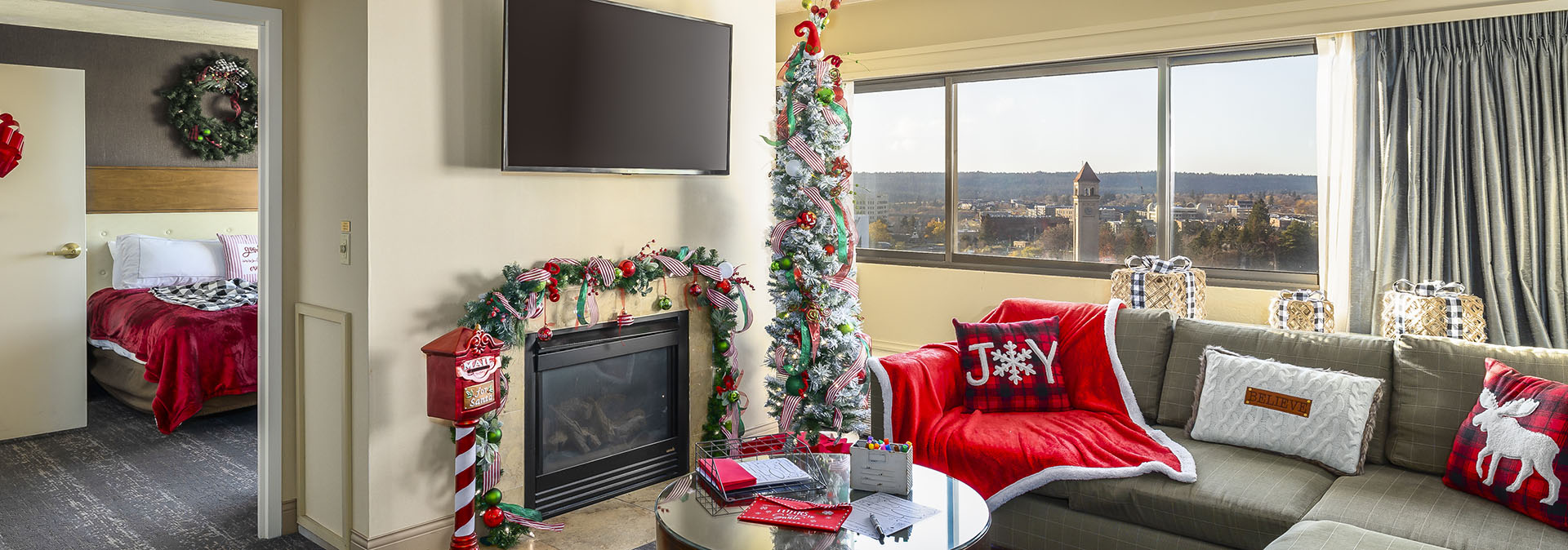 Available for a limited time, the Santa-inspired suite package is available in the hotel’s multi-room 1,400 square-foot Presidential Suite. The themed suite will transport guests to the North Pole fully adorned in holiday décor, including two fully lit and decorated Christmas trees, and guests will have access to tasty in-room treats such as hot cocoa, gingerbread cookies, and popcorn. Guests can also choose from an array of complimentary holiday movies while enjoying the best views of the holiday lights overlooking Spokane’s iconic River Front Park and cozying up next to the fireplace.
