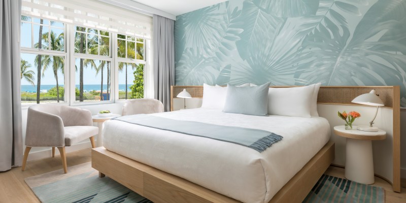 Offering a variety of room types, the hotel’s collection of guestrooms and suites all boast mid-century modern accents. With a special focus on coastal minimalism, the rooms feature Eric Brand light-wash rattan and fabric headboards, oak wood and white lacquer armoires, marble and wooden side tables, custom chaises, and vintage floor and wall lamps. All hotel beds include Sferra throw blankets which add a pop of color against the creamy ivory duvets. Each building has its own special touch that pays tribute to the structure’s history and design, such as nods to the Park Central building’s blue exterior. The hotel offers a selection of balcony suites, offering direct views of Ocean Drive, the Atlantic Ocean.